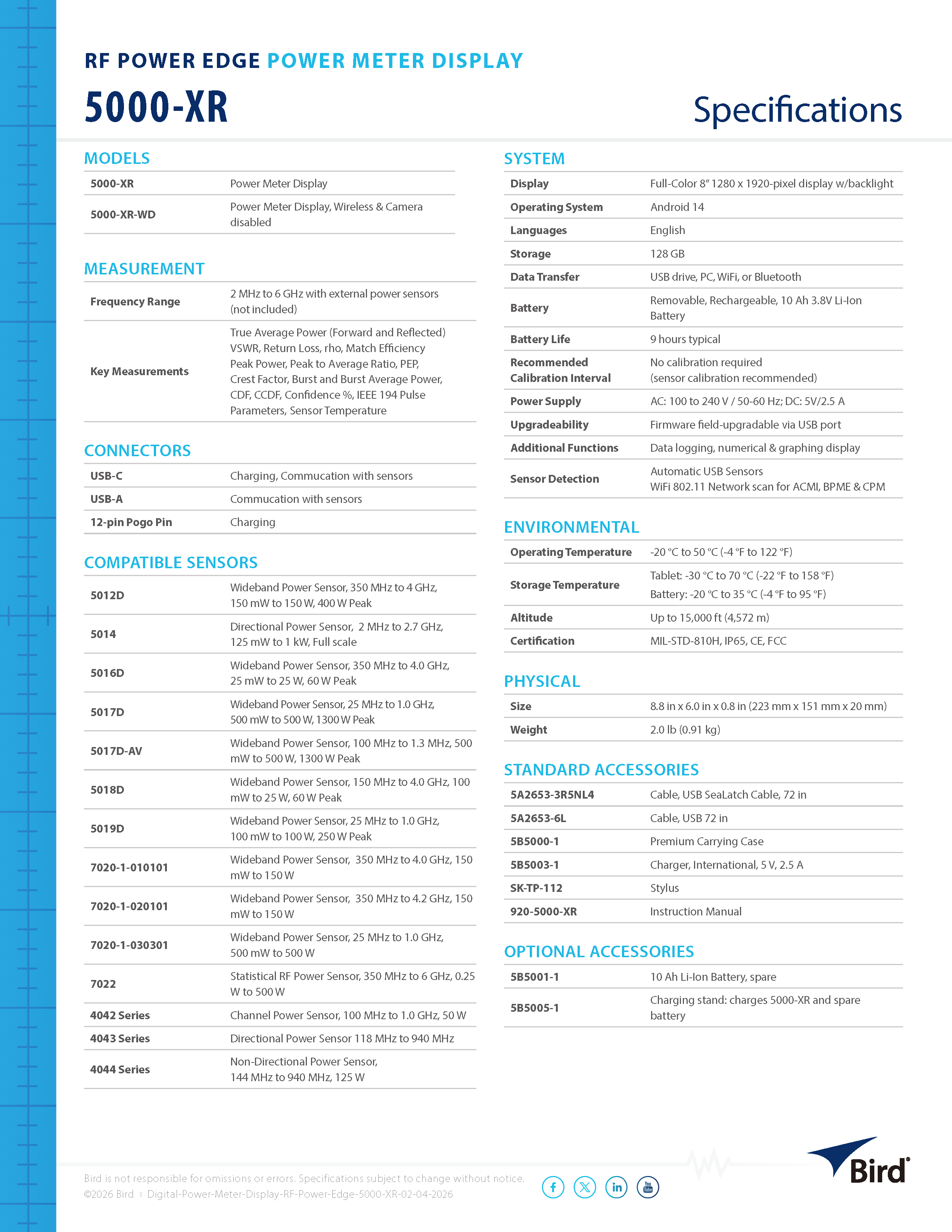 Bird全新5000-XR射频功率计显示单元彻底革新了射频功率测量方式。这款手持式便携设备通过触摸屏与高分辨率显示屏实时采集、存储并显示射频功率数据,无论在野外作业还是研发实验室环境中,均可实现快速便捷的数据查阅。